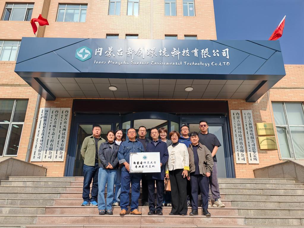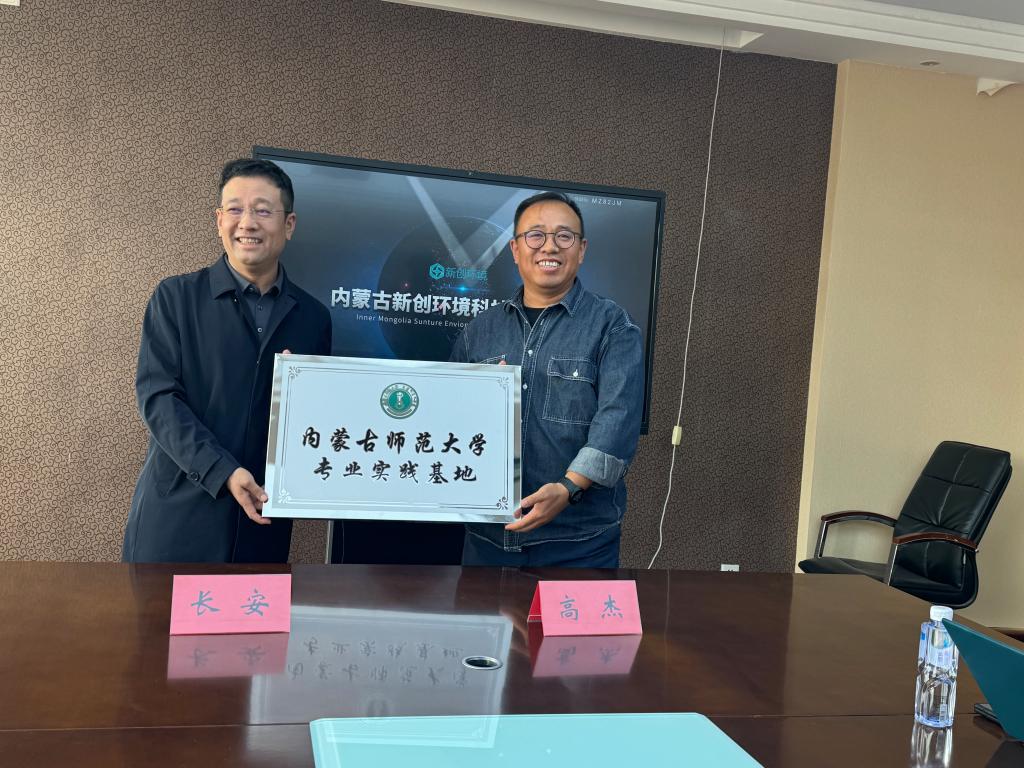 2024 年 10 月 9 日上午,beat365中文官方网站与内蒙古新创环境科技有限公司于该公司会议室成功举办校企合作共建专业实践基地揭牌仪式。内蒙古师范大学科研处副处长周丹丹、beat365中文官方网站院长长安、内蒙古师范大学教务处实践教学科董振华、地理系主任阿荣、副系主任郭恩亮与斯琴朝克图,以及内蒙古新创环境科技有限公司总经理高杰、行政副总马晶晶、总工张玮、东联循环(子公司)总经理王林、美成生态(子公司)总经理范志勇、众元测试(子公司)总经理郝文强出席了此次揭牌仪式。
