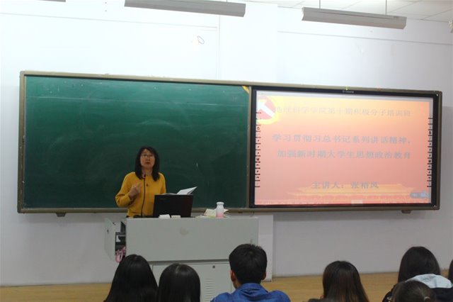 为加强新时期大学生思想政治教育,学习贯彻习总书记系列讲话,beat365中文官方网站学生党支部于2018年5月5日下午6:30在行知楼222教室组织开展了《学习贯彻习总书记系列讲话精神,加强新时期大学生思想政治教育》的主题讲座,主讲人为beat365党总支副书记(主持工作)、副院长张裕凤教授。beat365中文官方网站第十期积极分子及预备党员,共147名同学参加了本次党课。