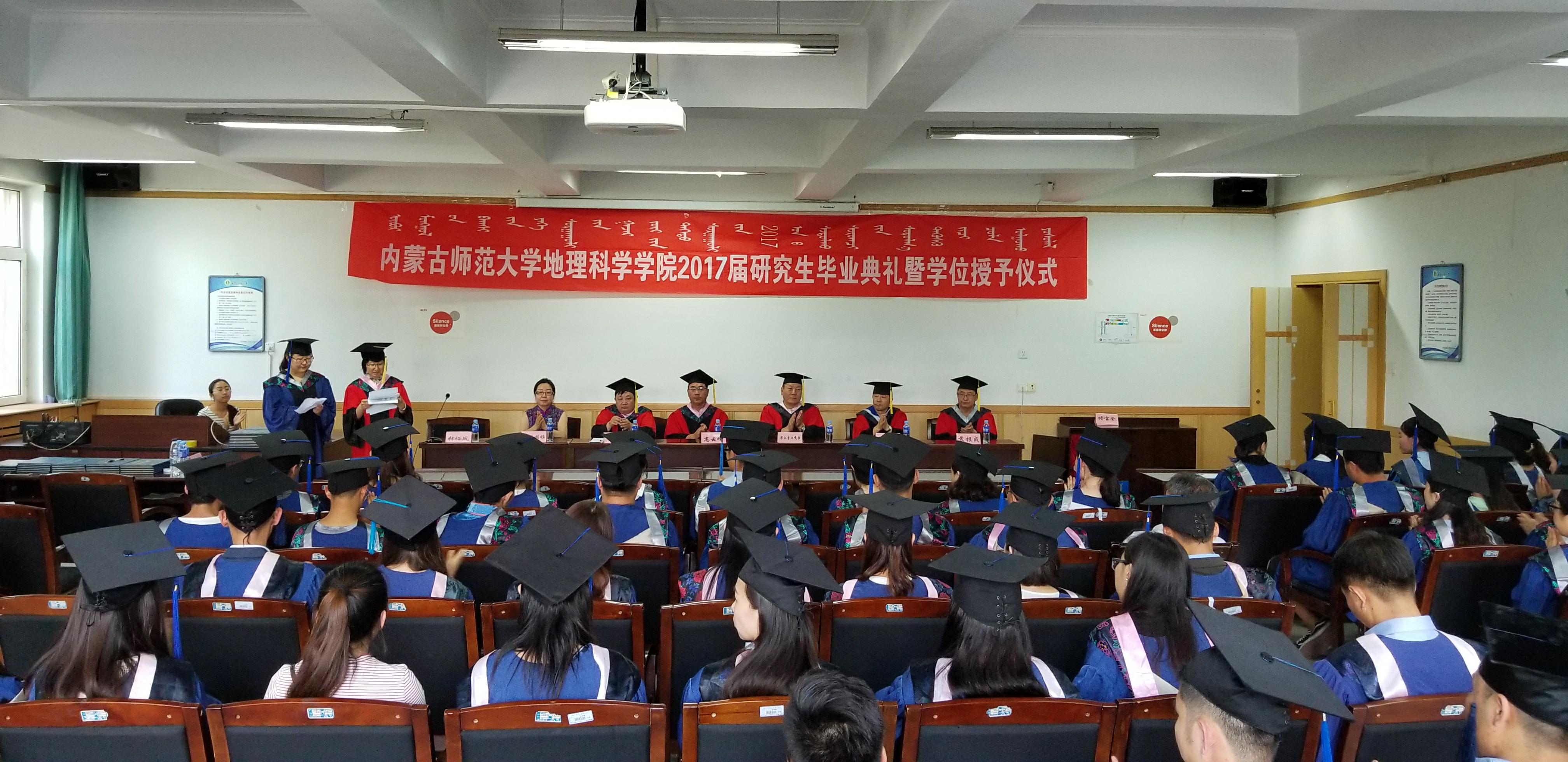 2017年6月29日下午三点,beat365在文史楼一号会议室举行2017届研究生毕业典礼暨学位授予仪式,由党总支副书记(主持工作)、副院长张裕凤教授主持仪式,参加学位授予仪式的还有校党委副书记、纪委书记高云峰研究员,beat365中文官方网站院长包玉海教授,副院长乌兰图雅教授,党委委员、党办主任布仁教授,内蒙古师范大学教师发展与教学督导评估中心主任徐宝芳教授和人文地理硕士点负责人佟宝泉副教授。