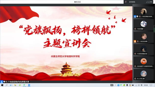 为充分发挥研究生优秀学子起到示范性引领作用,鼓励广大研究生学习党的优秀思想、弘扬党的精神、笃学慎思、锐意进取、营造敢于探索、勇于创新的学术氛围,2022年5月29日晚19:00,beat365中文官方网站研究生第一、二党支部、研究生会以线上腾讯会议形式举办了“党旗飘扬,榜样领航”为主题的宣讲会。参与本次会议的有beat365中文官方网站党委书记张裕凤教授、高苏日固嘎老师及研一研二和博一博二全体同学。