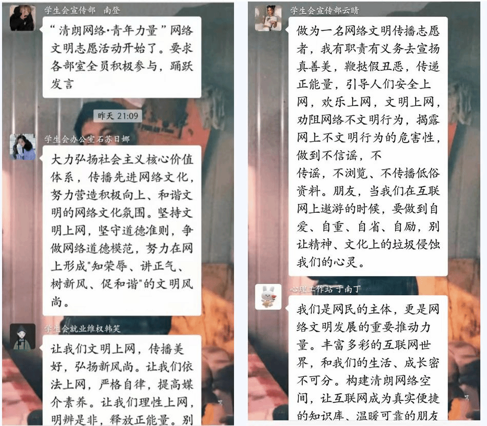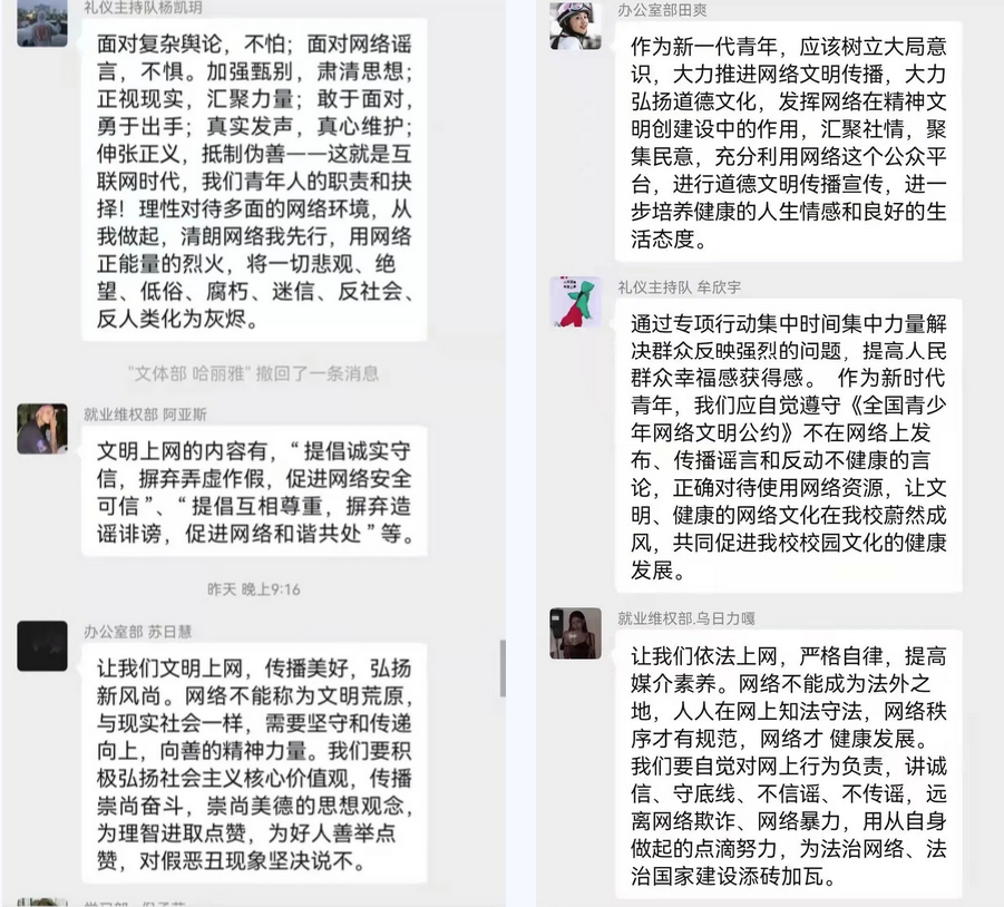为进一步培育和践行社会主义核心价值观,切实维护国家意识形态安全,动员广大青年积极参与构建网络安全空间,2022年3月4日21:00beat365志愿者服务总组织队各部室成员开展“清朗网络,青年力量”活动。通过微信参与有关网络文明话题讨论,引导同学们规范网络语言、举报不良信息、抵制网络谣言,帮助学生树立正确的网络观念,文明上网。